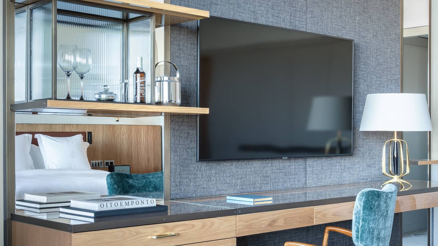 Inspired by the Hotel’s original 1950’s style, these comfortable rooms offer private terraces perfect for morning coffee. Steeped in symbolism, the chairs are modeled after the 1959 Card Room and add luxury with their rich blue and teal crushed velvet accents.