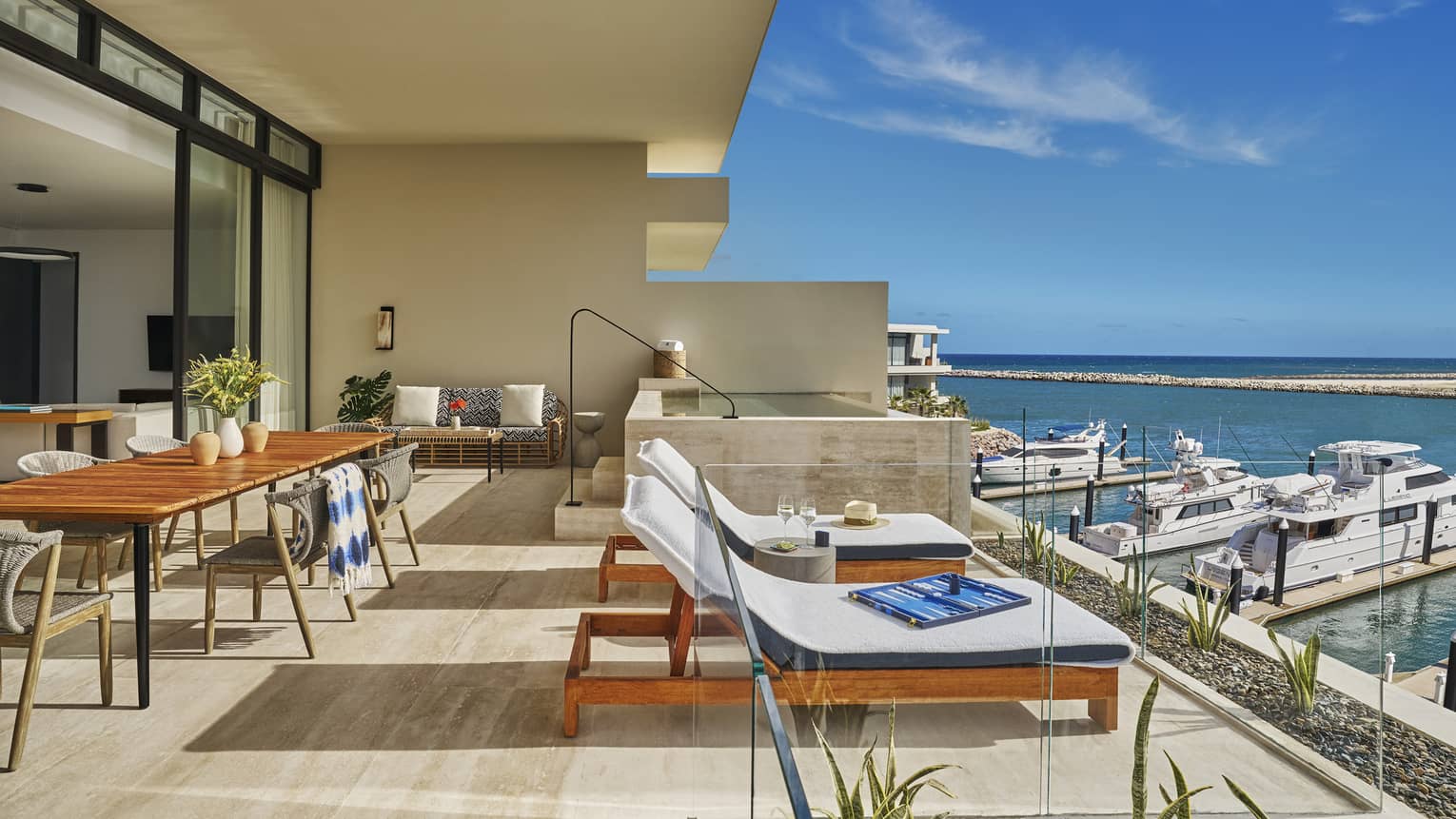 Sleek minimalist design puts all of your focus on views of the tranquil Sea of Cortez. Glass walls slide away, opening to a private terrace that’s furnished for outdoor living and dining.