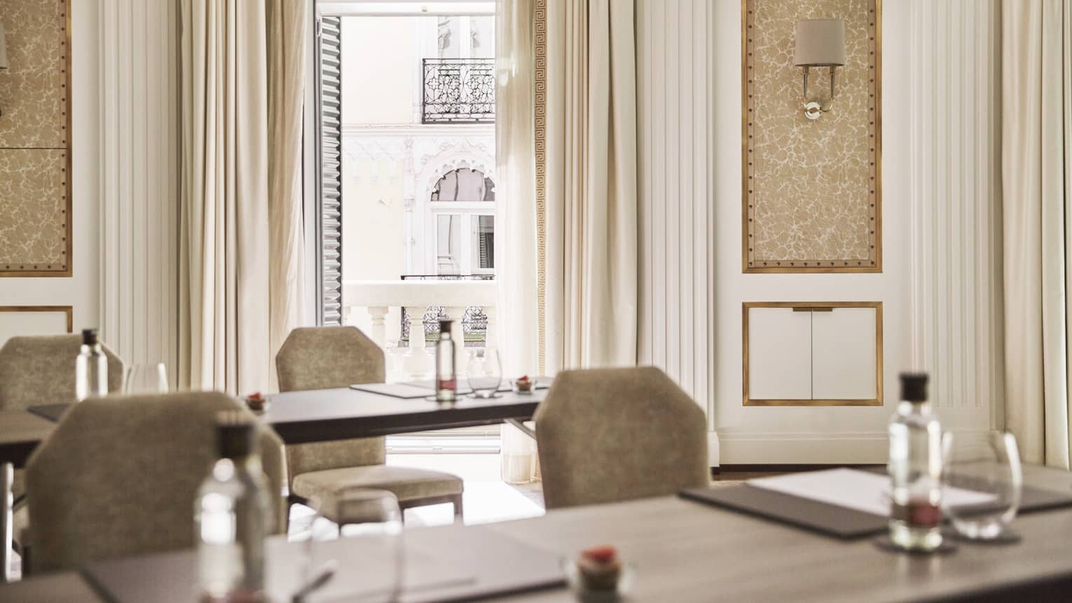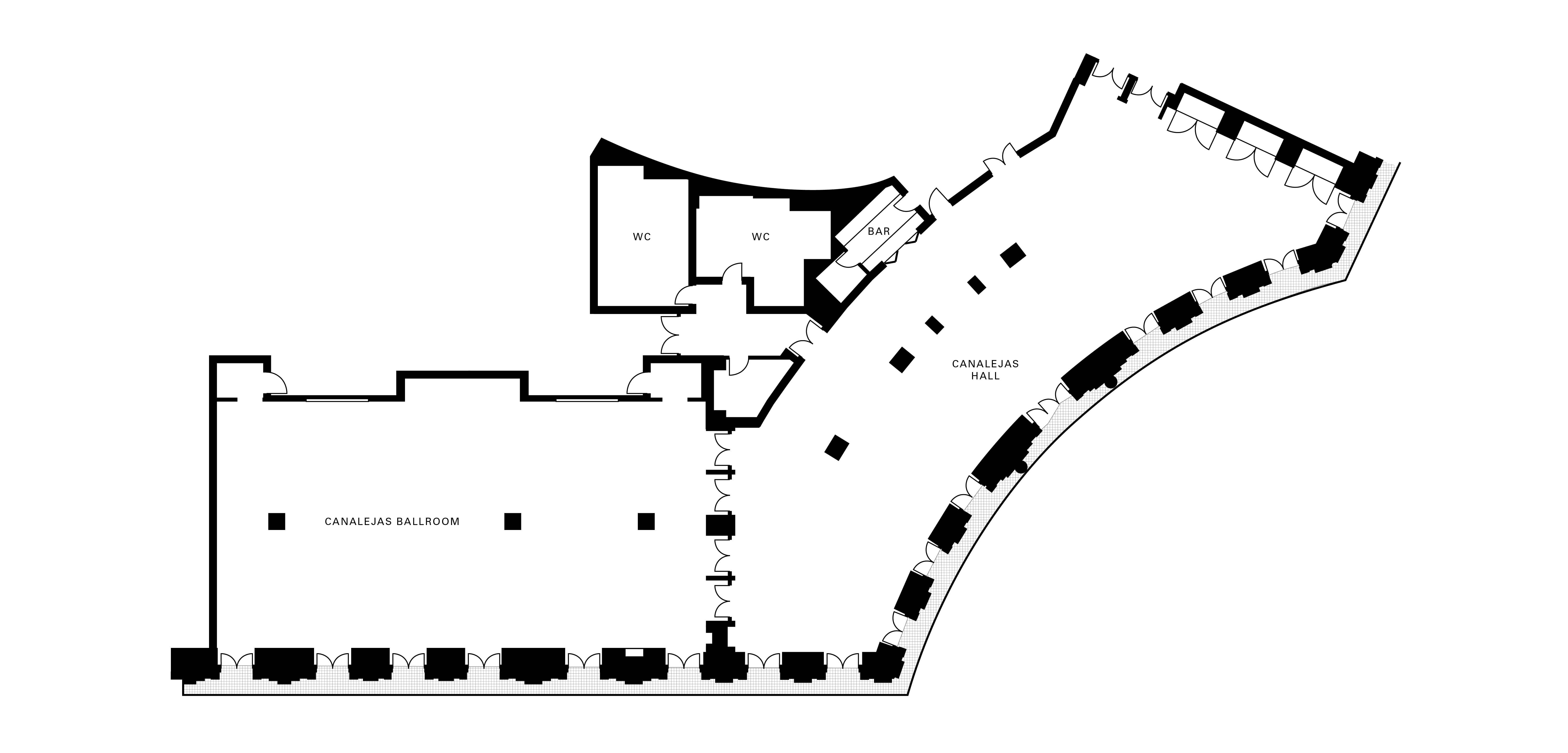 Filled with abundant natural light, our intimate Canalejas Ballroom features a series of south-facing windows overlooking Carrera de San Jerónimo. Versatile for both meetings and celebrations, this wide rectangular space embodies the classic grandeur of the original architecture. The entrance is through the impressive Canalejas Hall, serving as a sun-filled pre-function space.