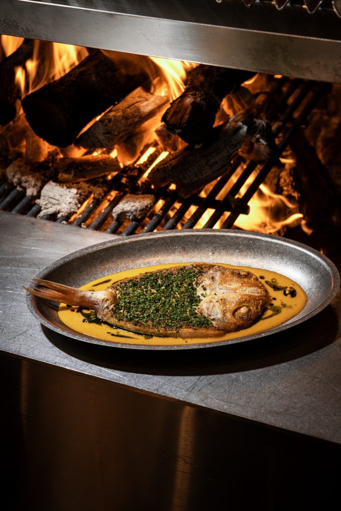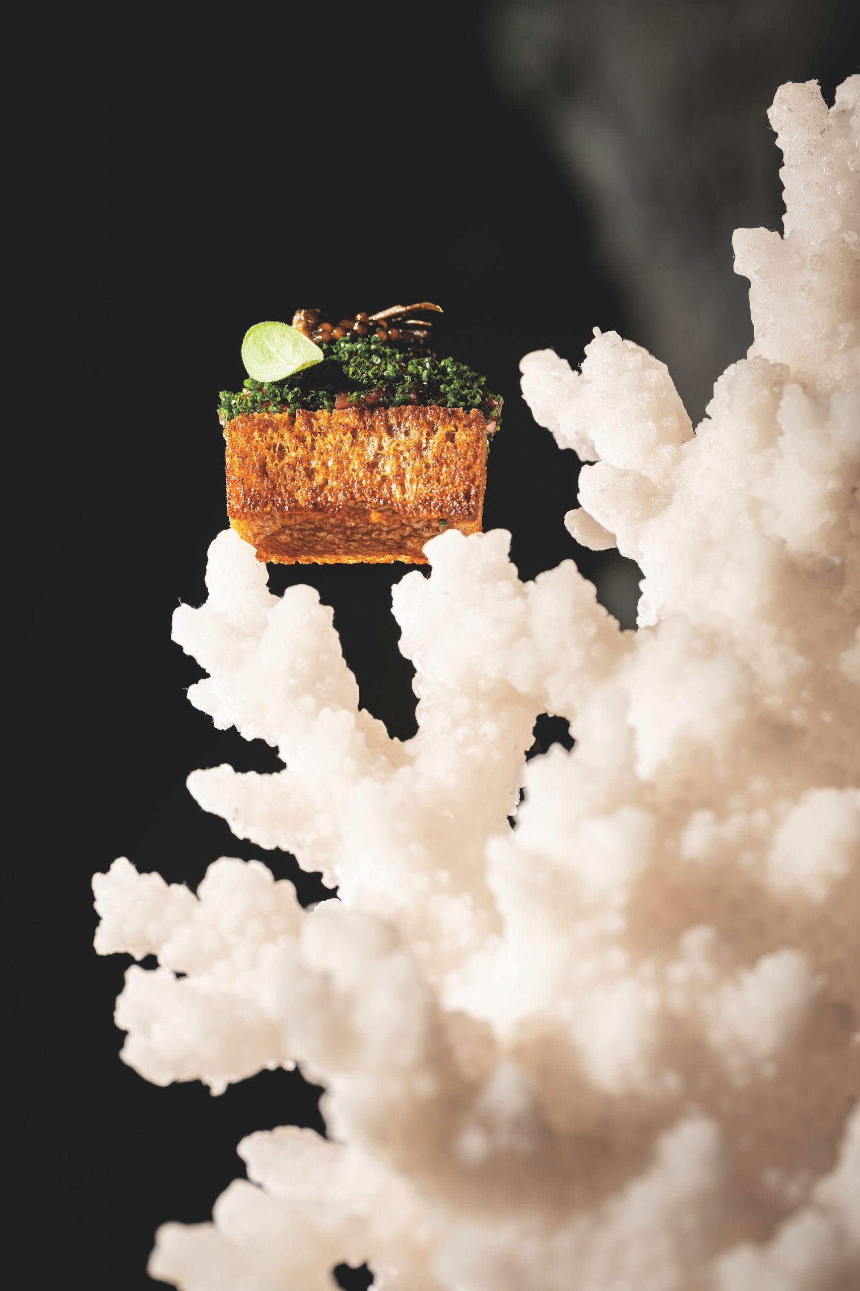 The culinary action unfolds in a large open kitchen where fish skeletons hang next to a wood-fired grill. My dinner begins with shrimp chicharron crisps standing upright in a bed of dried black beans. They look like kelp rising from the ocean floor and are accompanied by labneh—dusted with loomi (dried lime powder)—for dipping. Next comes a yellowtail-tuna pizza served on a meringue base. It looks and sounds weird, like a fishy pavlova, and I hesitate before taking a bite. But the base has none of the cloying sweetness or stickiness I’d expected and instead presents a brilliant balance of rich and spicy flavours with crunchy and chewy textures. Strange, yes, but also strangely moreish.