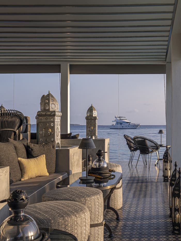 Perched over the lagoon on Al Barakat’s lower level, this pre-dinner hot spot is open to the sea, with curtained sofas and ornate lanterns that set an atmospheric mood for cocktails or Turkish coffee and shisha.