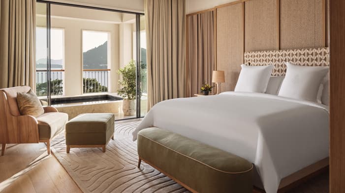 The pinnacle of luxury at Formentor, this extraordinary suite crowns the Resort’s highest floor with breathtaking views of the Bay of Formentor. Designed for an unparalleled family retreat, it offers ample living spaces, a large terrace with a luxury jetted tub, and three comfortable interconnected bedrooms for enhanced privacy and effortlessness.