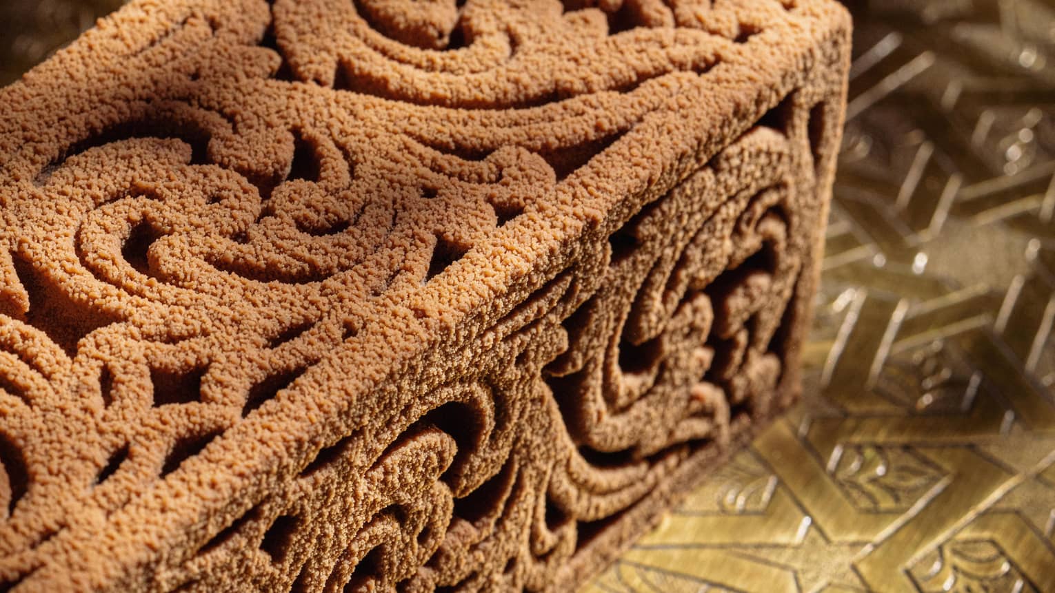 Handcrafted by our Pastry Chef Anouar Ait Abdelaali, the festive cake showcases design inspired by Moroccan woodwork and Almoravid motifs, and combines soft date biscuit, Majhool date heart and white chocolate mousse with orange. Serves 6–8. MAD 650. Order 48 hours ahead: +212 524 359 200.