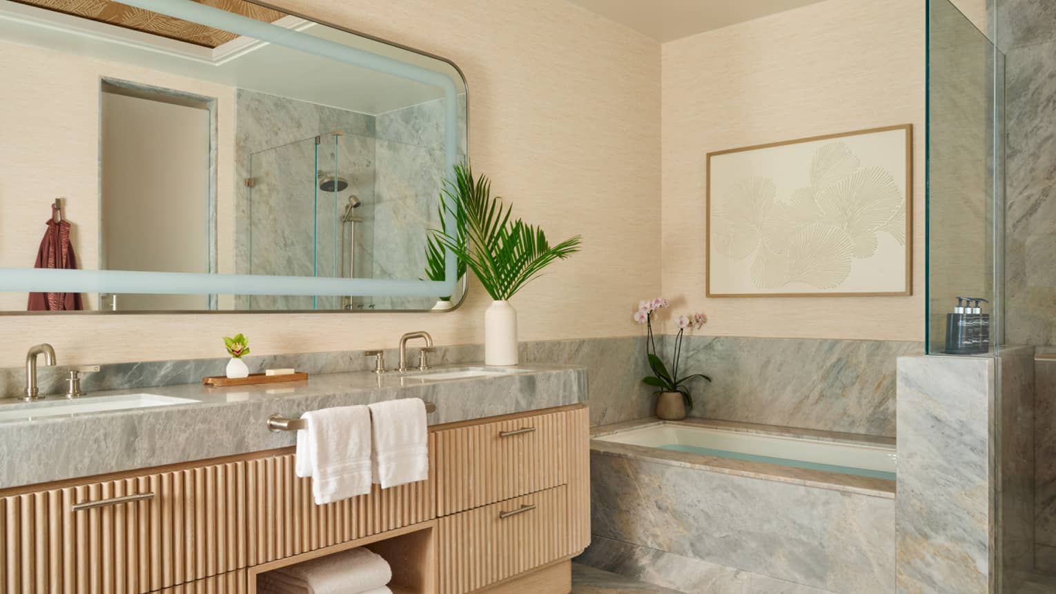 Oversized marble bathroom, with deep soaking tub, separate shower and double-basin vanity