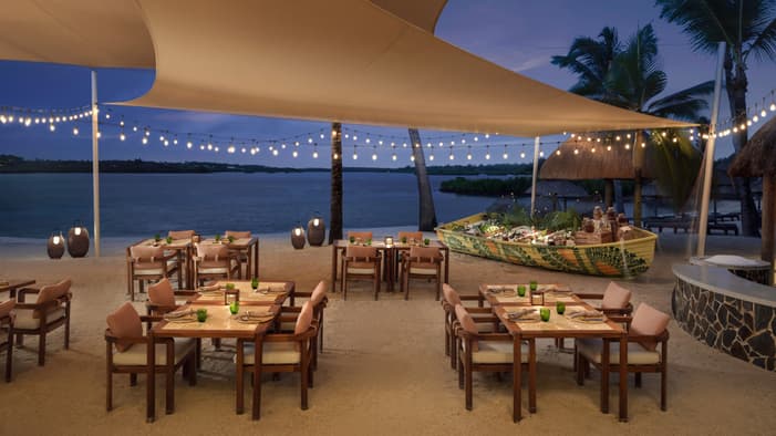 Each week, experience a vibrant beachfront dining atmosphere under the stars. Delight in a menu inspired by Creole flavours, accompanied by the rhythmic sounds of live music.