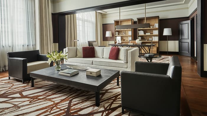 Soaring ceilings, hardwood floors and a rich, indigenous-inspired colour palette of persimmon, sky blue and gold make this specialty suite feel like an elegant Mexican home – one with plenty of room for entertaining.