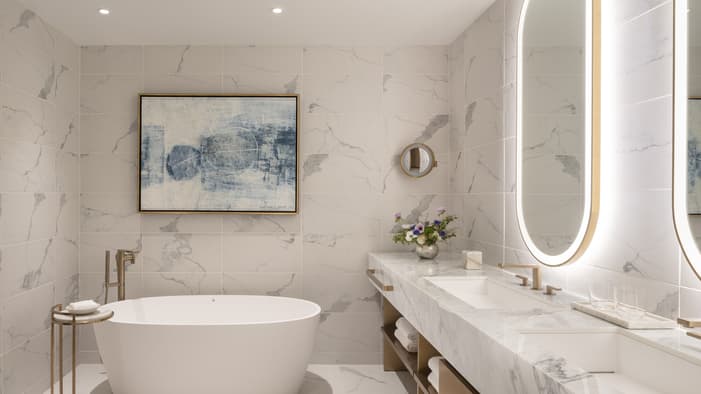 Our hotel suites in Minneapolis, Minnesota, are designed for your comfort and enjoyment, featuring radiant heated flooring and oval soaking tubs. Located near sports venues, business districts and entertainment options, these suites offer stunning, unobstructed views of the city or river. For families and large parties, we provide adjoining rooms to ensure ample space and convenience. Enjoy your stay in our luxurious accommodations in Minneapolis.