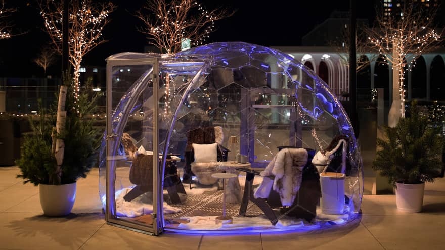 SnoHaus & Outdoor Hot TubSnoHaus invites you to an elevated outdoor hot tub experience. Beneath a clear dome, plush blankets, faux furs and a cozy electric fireplace create the perfect winter escape for relaxing and socializing in the crisp outdoor air. Hotel guests and residents enjoy complimentary access when using the outdoor hot tub. Spa guests can reserve a curated experience Monday through Thursday by calling +1 (612) 895-5707. SnoHaus is open daily from 7:00 am to 9:00 pm.