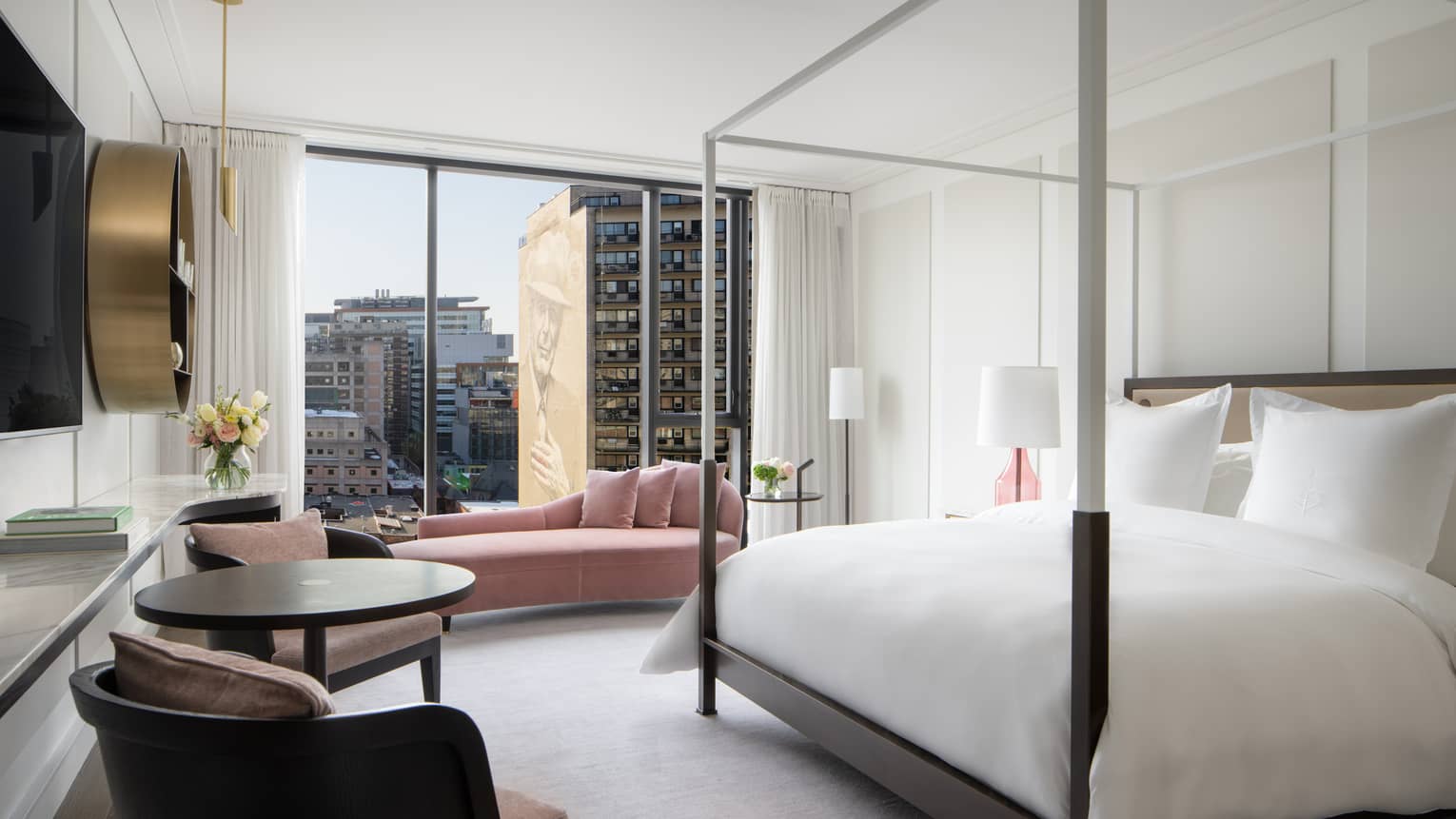 Our Premier Room offers a blend of luxury and avant-garde design in Montreal’s most desirable location. These hotel rooms in Montreal downtown include a chaise longue, a small table for work or dining, and large windows that flood the space with natural light. The boldly designed bathroom features a free-standing tub beside mirrored panels that open to the bedroom. Relax and unwind in this sophisticated setting for an unforgettable stay in one of the best Montreal hotel rooms.
