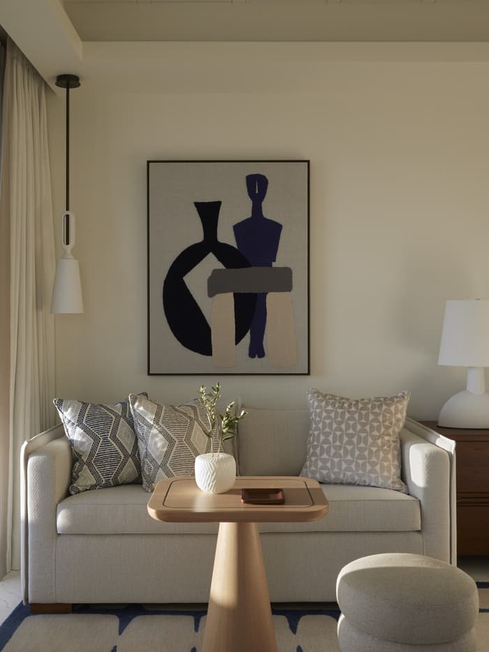 You’ll fall in love with this chic Mykonos suite, open to a terrace with elevated Aegean views. For anyone sleeping on the living room’s sofabed, there’s a convenient powder room with shower. A sliding door provides a sense of privacy for the king bedroom and luxe en suite bath.
