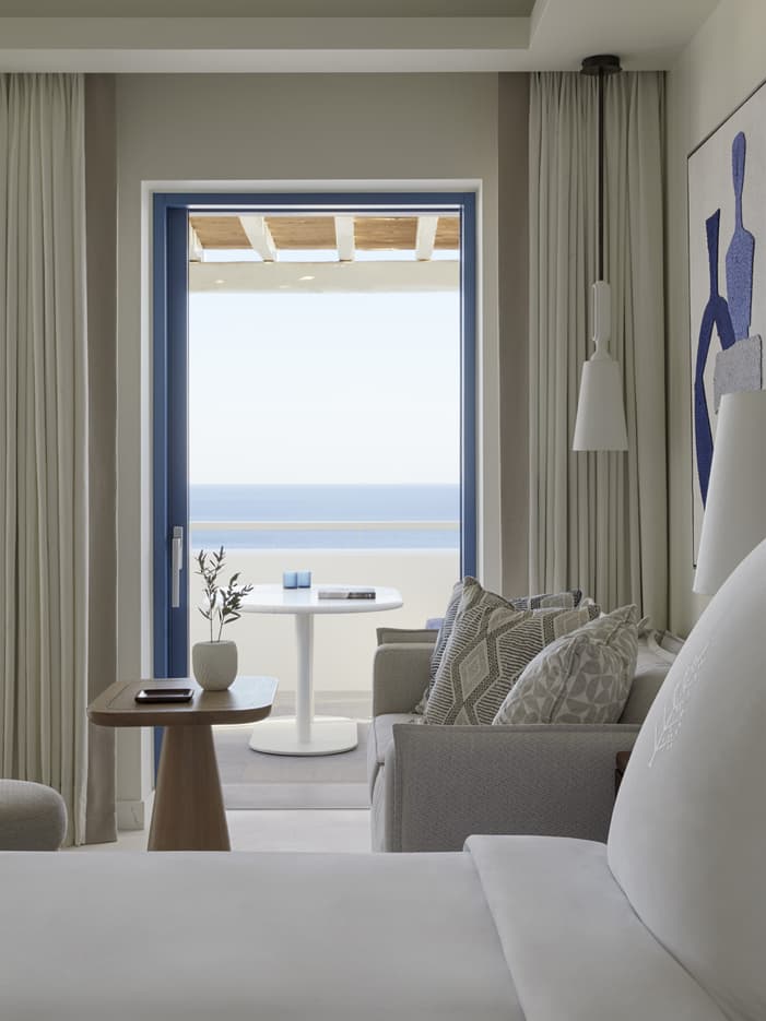 Inspired by a classic Mykonos home, this two-level suite welcomes you with a spacious living room that’s open to a large terrace with a sea-view pool – your own private retreat. At day’s end, escape to the upper-level bedroom with your choice of king bed or two double beds.