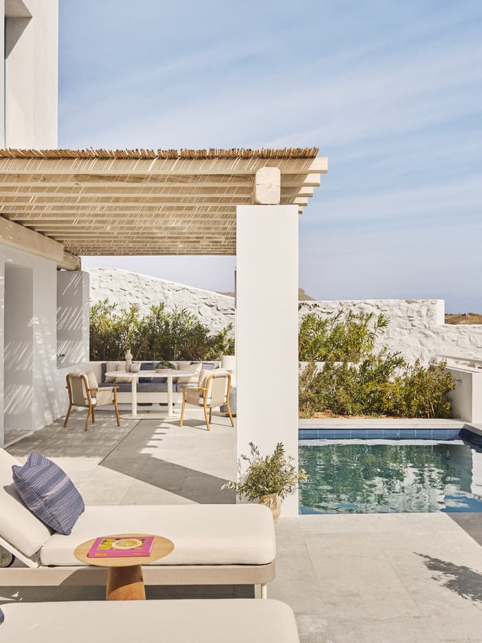 Soak in views of the Aegean as you dip into your own private pool set on a terrace designed as an outdoor living room. The indoor living area includes a comfy sofabed and powder room with shower, while the king bedroom is separated by a sliding door.