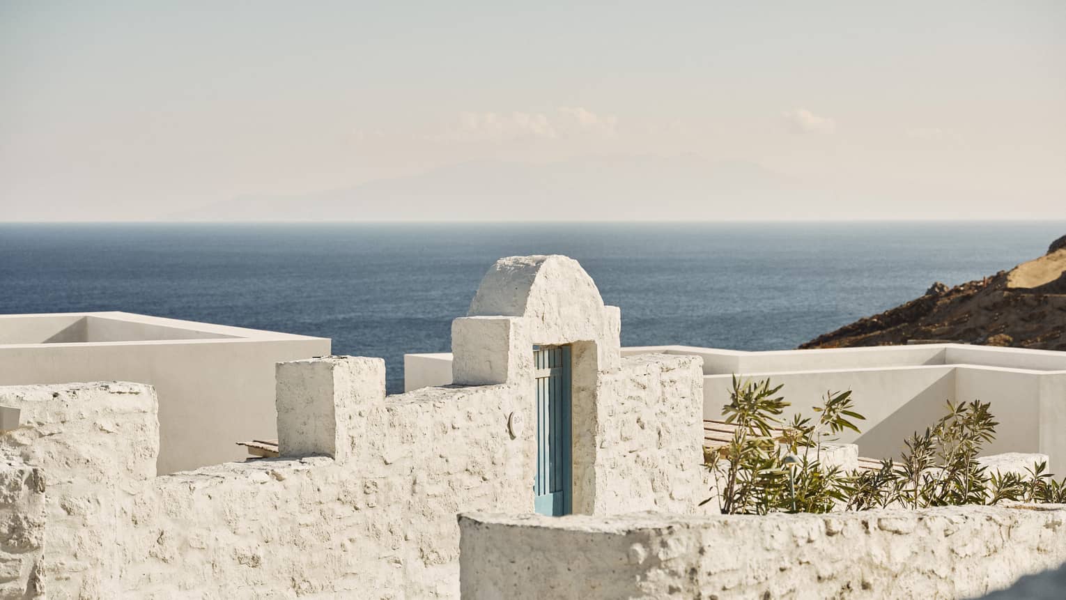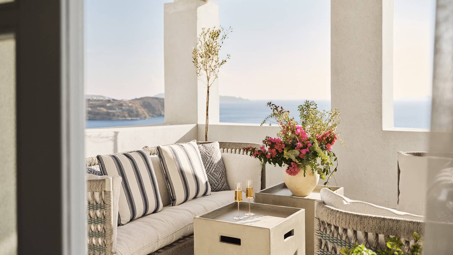 Sip morning coffee in your Deluxe Sea-View Room with 360-degree views of the Aegean Sea.
