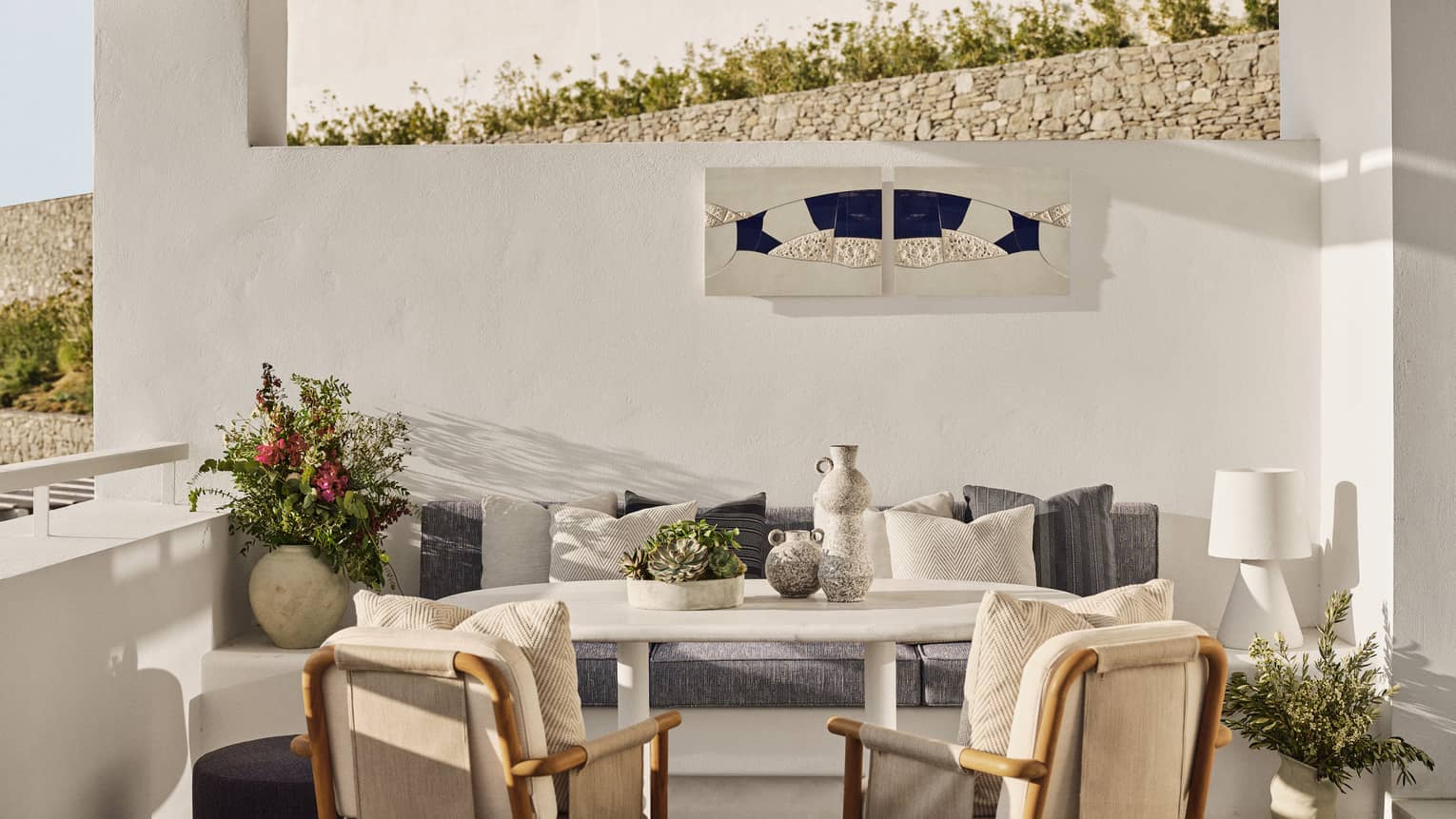 Our lobby invites you into a warm, residential-inspired haven, offering a curated and romantic introduction to Mykonos.
