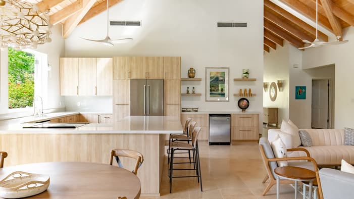 Chic, two-level, sun-filled spaces, these three- and four-bedroom luxury villas in Nevis, West Indies encourage indoor-outdoor living with panoramic views of Nevis Peak and the golf course – just a three-minute walk to the beach.