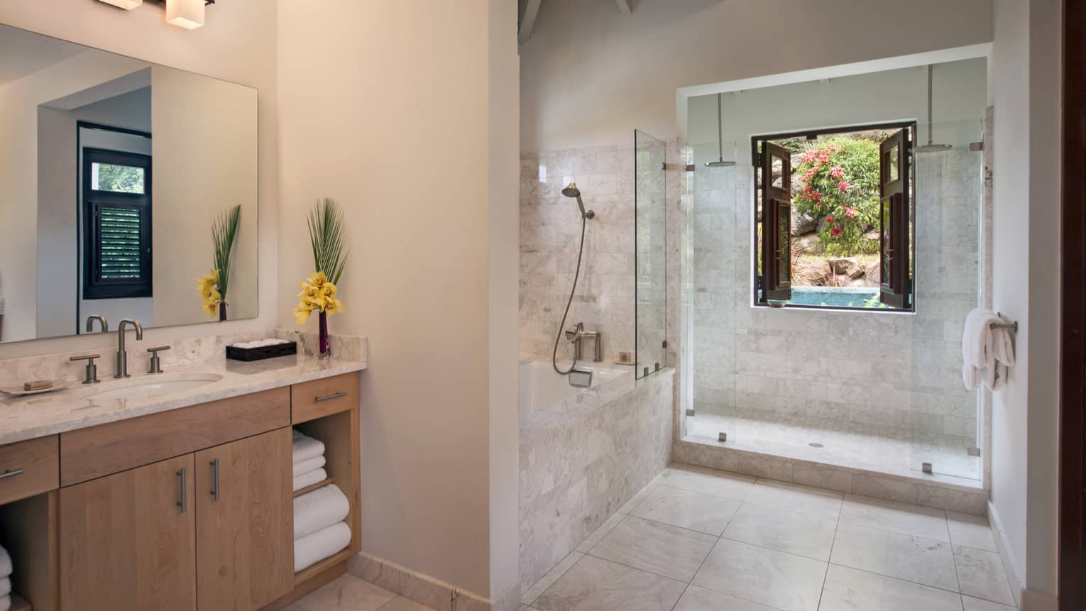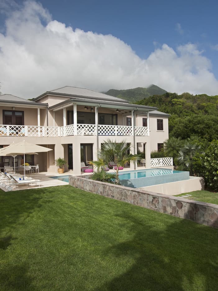 This vibrant Caribbean-style home overlooking St. Kitts and the Caribbean Sea is ideal for entertaining or simply relaxing in the sun, complete with spacious indoor and outdoor living areas. The bright primary suite overlooks the natural blue hues of the Caribbean while the guest rooms are tucked away to create a sense of privacy. Friends and family are sure to love coming together in the living room before taking a dip in the heated vanishing-edge pool or enjoying an evening of dinner and bocce ball. This expansive estate is just five minutes away from the main property via your golf cart.