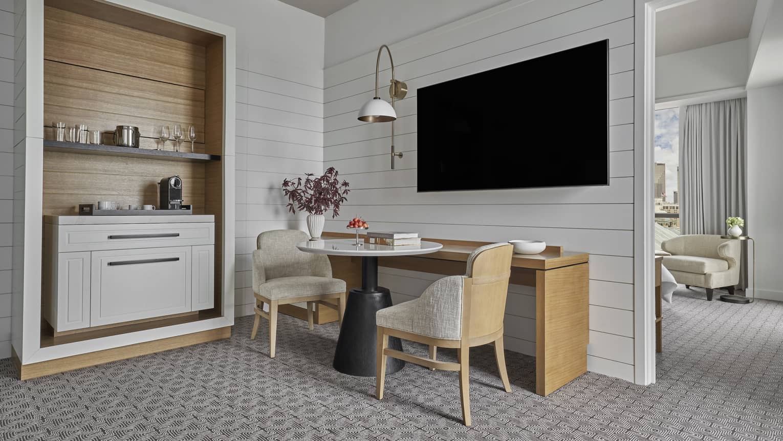 Fresh, crisp and modern design; shiplap walls in homage to Mississippi riverboats; customized lighting that transitions naturally from day to night