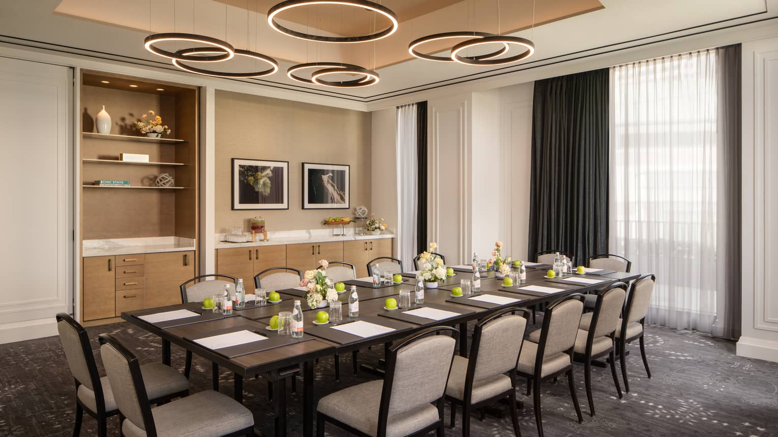 For smaller meeting sessions, this breakout room offers a comfortable, residential design, complete with a built-in credenza and storage space. A floor-to-ceiling window brings natural light and views of the cityscape, while a glass door accesses the historic wrap-around terrace – providing fresh air and a convenient outdoor location for coffee breaks or lunch.