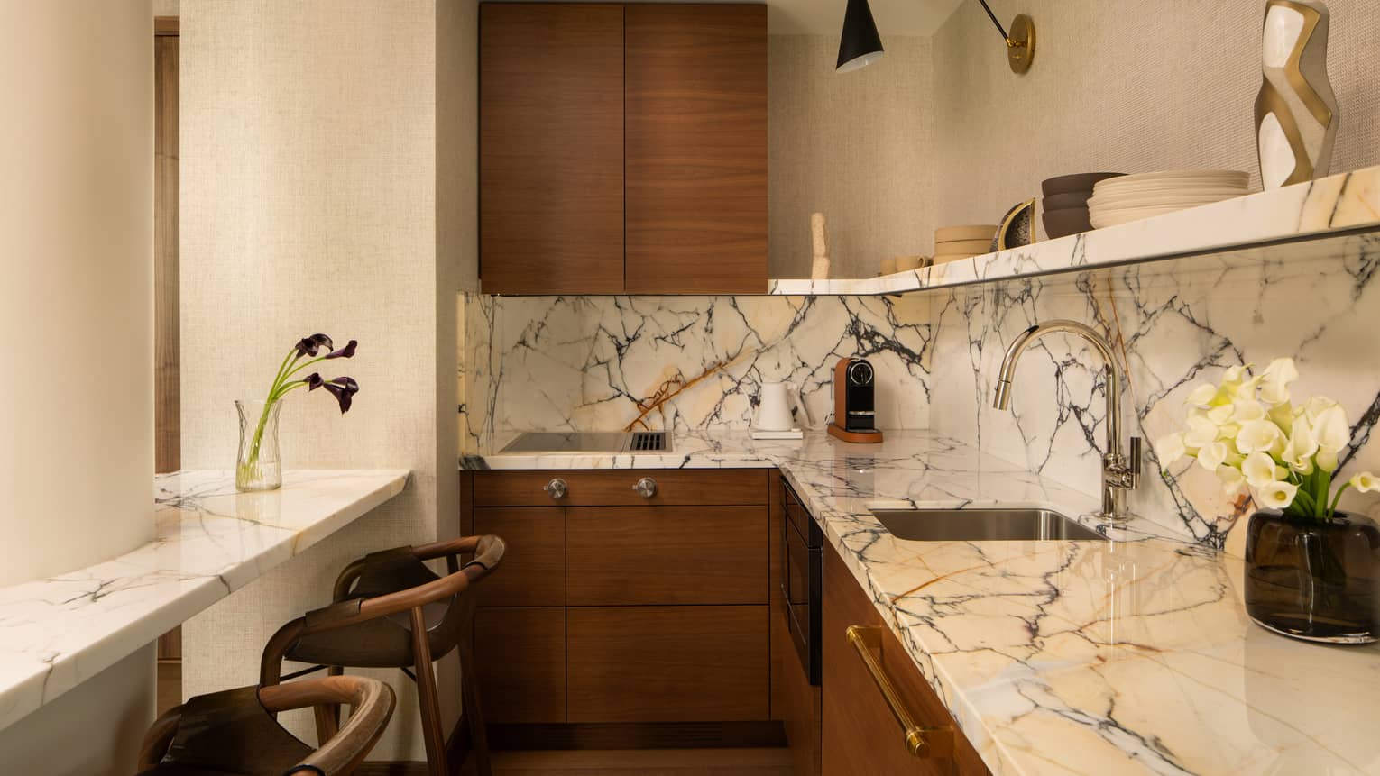 The Empire SuiteTaking up half of the 24th floor, our largest suite is where New York cool meets Four Seasons comfort. An art installation welcomes you in the entryway, the dining area is large enough to hold catered dinners for ten, mid-century modern furniture is arranged around a gas fireplace a private media room beckons sports games or family movie nights. The Empire Suite truly has it all.