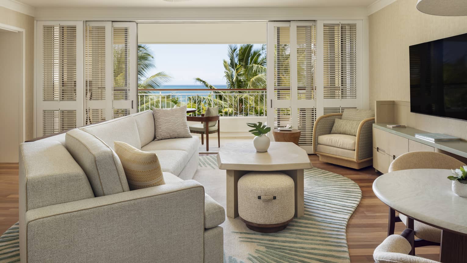 Separate bedroom and living room; Private balcony with seating for two; Refrigerated personal bar