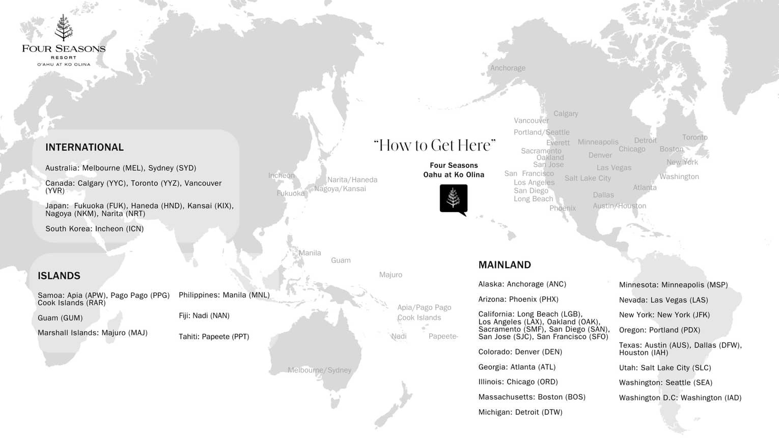 The Resort is conveniently located on the west coast, just 30 minutes by car from Honolulu International Airport (HNL) with transfers available upon request. Allow our Concierge to assist with your arrival experience so you can start your stay in utmost comfort.