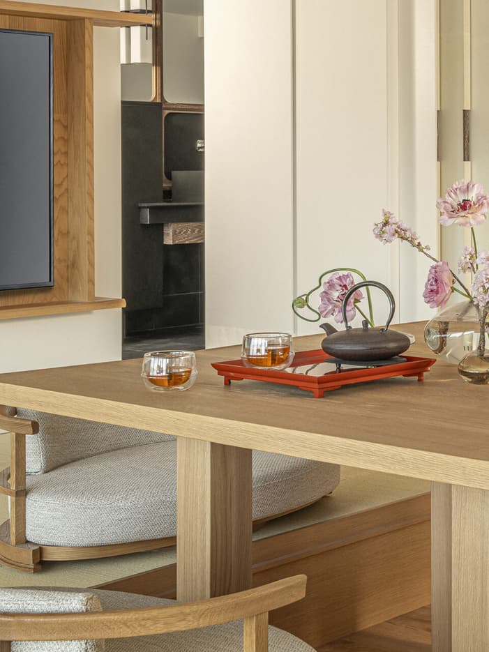 Slip off your shoes at the door and get ready to experience modern ryokan living on an expansive scale. Brightened by spectacular Osaka vistas, our most spacious Japanese suite features a sunken dining table for four and a large daybed by the picture window. Enjoy a scenic soak in the bathtub with a view before drifting into a restful sleep on the luxuriantly soft mattress of a traditional Japanese futon complete with a washi-clad headboard. This suite forms part of the GENSUI Modern Ryokan Floor.