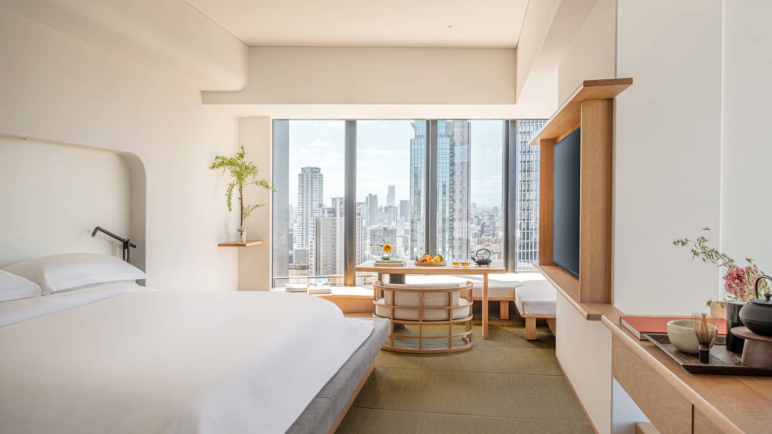 Slip off your shoes at the doma entrance area and step barefoot into a light-filled oasis of tranquillity and tradition. Featuring distinct sleeping and living areas, this corner suite overlooks sweeping cityscapes, with the Japanese-style bathroom with a view completing your modern ryokan experience. This suite forms part of the GENSUI Modern Ryokan Floor.