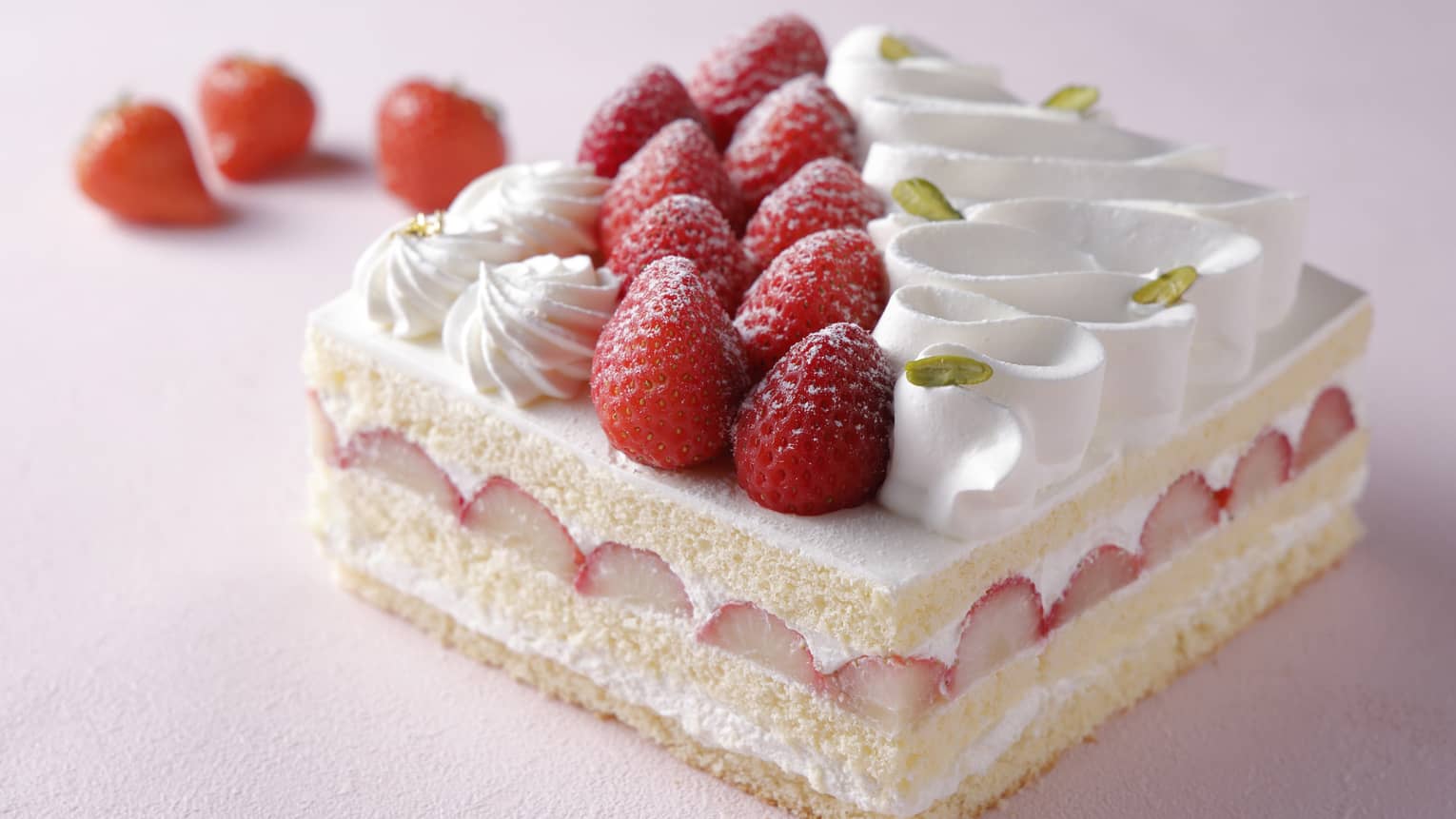 This cake features a light sponge, generously layered with domestically grown strawberries prized for their perfect balance of sweetness and acidity, and fresh whipped cream. JPY 1,350 per slice; JPY 7,200 per whole cake (13 cm x 13 cm).