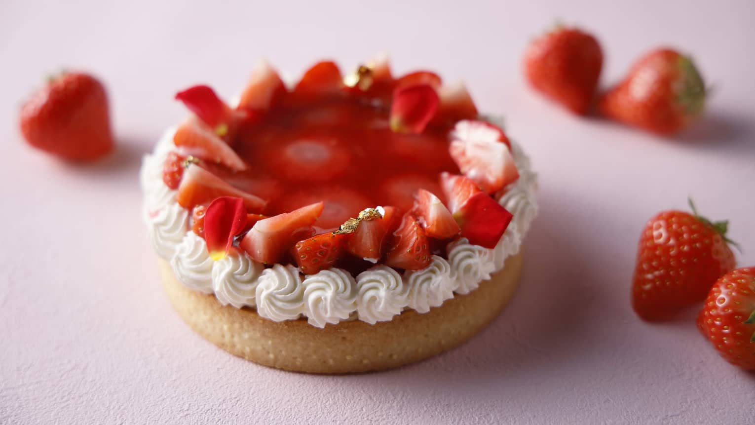 This tart is generously topped with locally grown strawberries on a crisp baked crust. The sweet and tart of the strawberries harmonize with rich cream to create a luxurious flavour. JPY 1,350 per slice; JPY 6,000 per whole tart (12 cm).