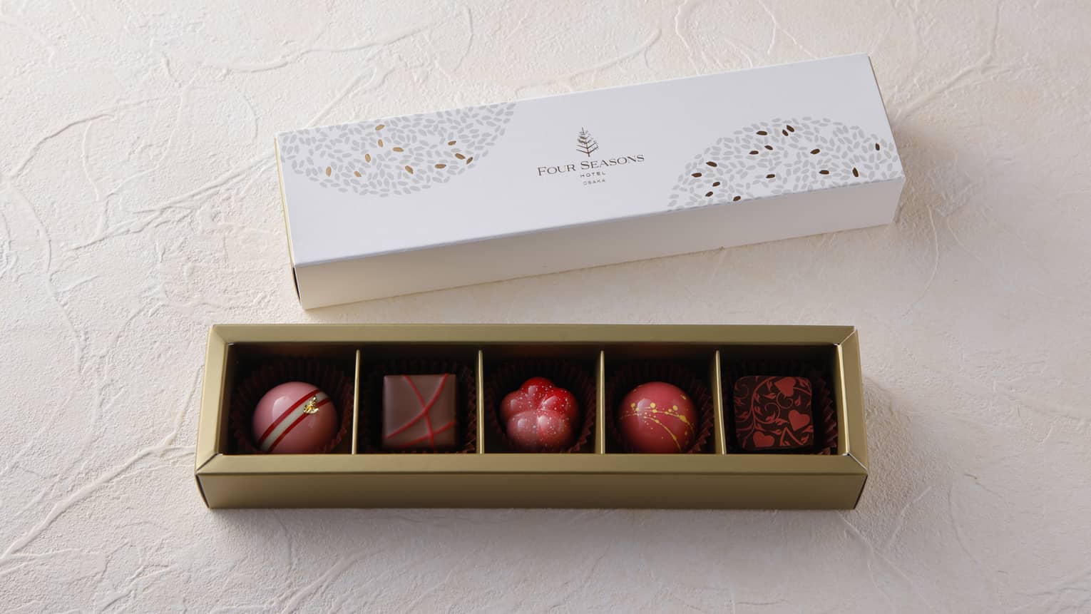 Farine reinvents the classic Saint-Honoré by replacing traditional puff pastry with croissant dough for an extra crispy texture. The pastry is filled with vanilla custard and mini cream puffs, then topped with rose-scented cream inspired by Osaka’s Nakanoshima Rose Garden, and finished with raspberry and caramel choux. Five pieces: JPY 4,500.