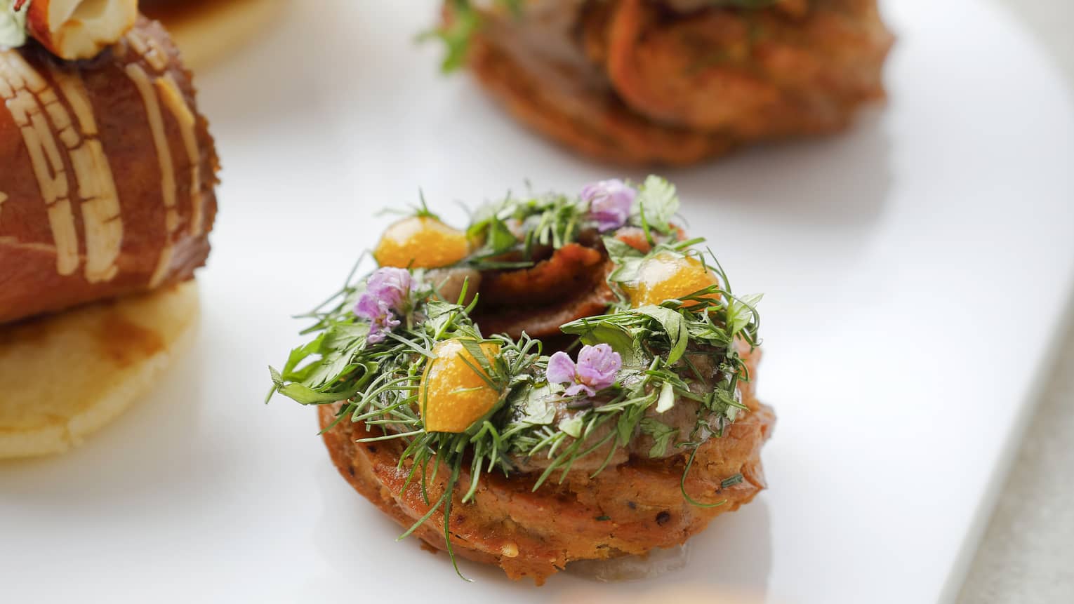PORCINI CHURROS WITH CHESTNUT AND FOIE GRAS CREAMApricot Purée, Mixed Herbs, Hojiso