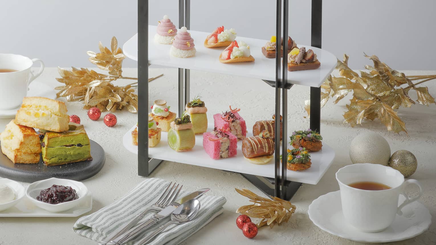 Savour sweet delights like pistachio Bûche de Noël and Amaou strawberry gratin, alongside savoury bites such as foie gras churros and smoked salmon mousse with caviar. Warm scones, seasonal condiments, and free-flowing tea and coffee are also included. Price starts at JPY 10,800 per person.