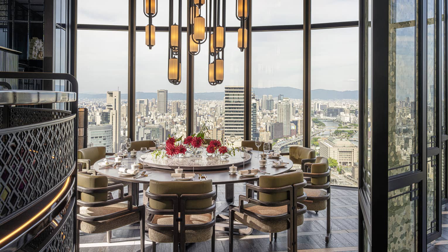 Semi-private dining roomWith ample space for 4 to 10 guests, our semi-private dining room offers views of the Osaka cityscape, riverside, Osaka Castle and Mount Ikoma. It’s the ideal setting for business meetings, gatherings with friends and family, or celebratory events.