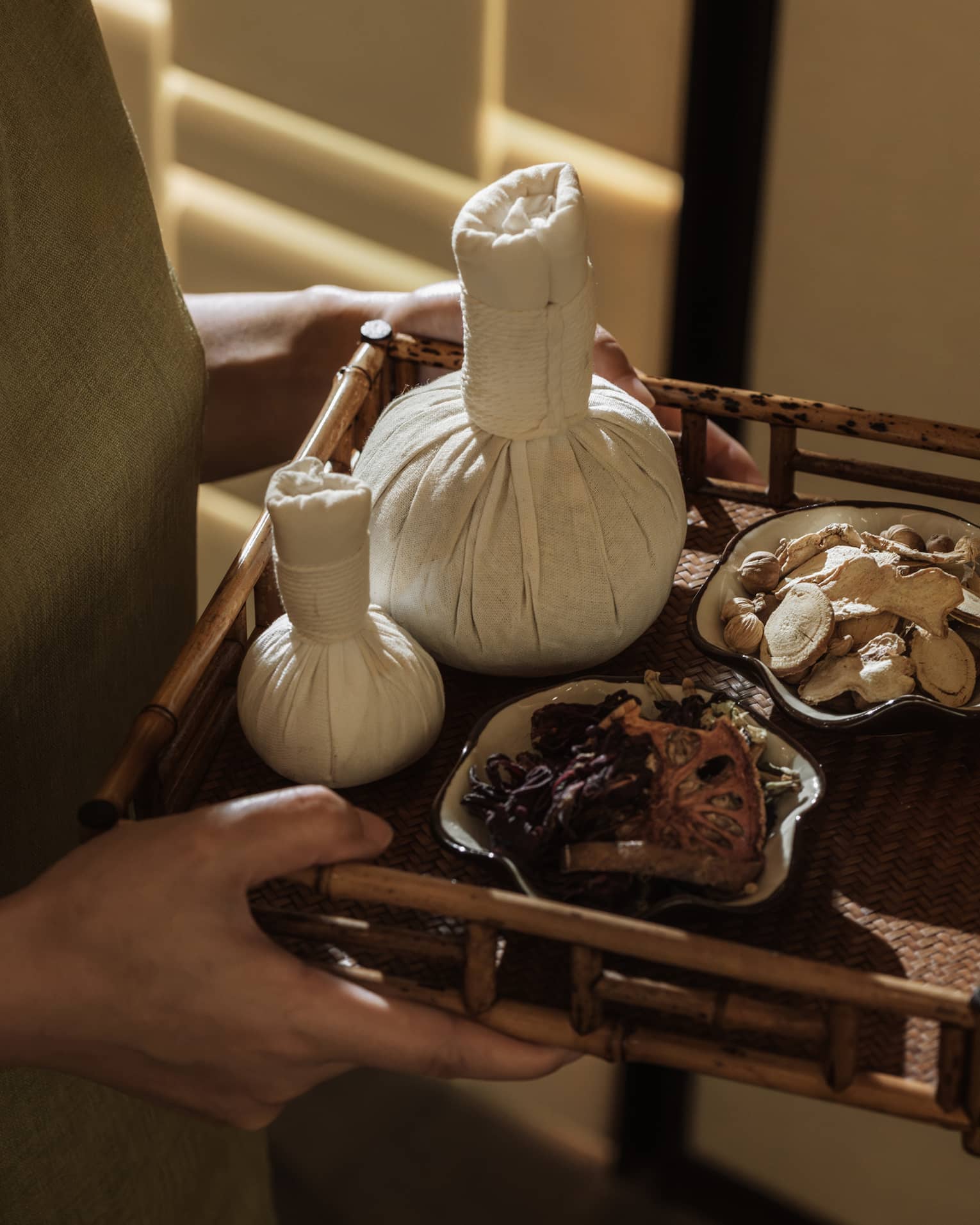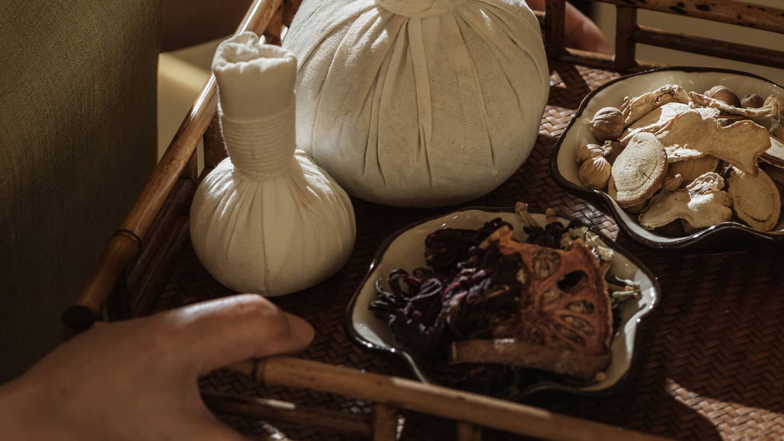 A heated bundle of seasonal traditional herbs is used to treat the body. The herbs' natural properties enhance the relaxation and healing effect.