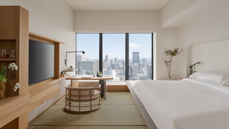 Tatami Premier RoomFramed by floor-to-ceiling views of Osaka, our modern Japanese guest rooms invite you to experience ryokan living in the 21st century. Embrace local customs as you walk barefoot across the tatami floor and find a new sense of serenity on the luxuriantly soft mattress of a traditional Japanese futon.