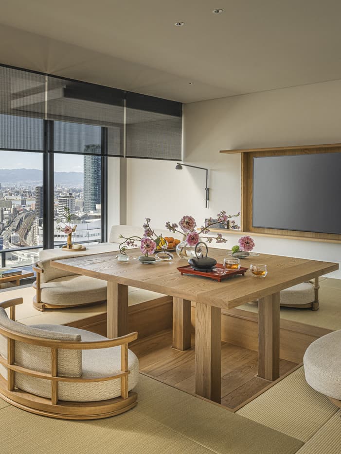 Tatami Corner SuiteSlip off your shoes at the doma entrance area and step barefoot into a light-filled oasis of tranquillity and tradition. Featuring distinct sleeping and living areas, this corner suite overlooks sweeping cityscapes, with the Japanese-style bathroom with a view completing your modern ryokan experience.