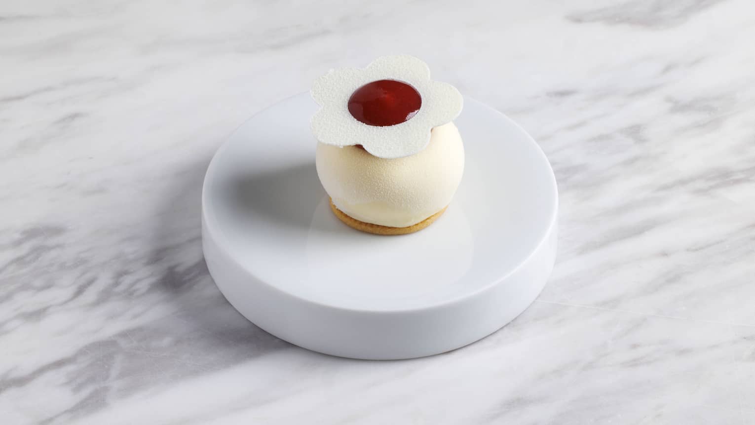 HONEY BAVAROIS AND FRAISE DES BOIS CONFITUREDiscover a graceful encounter between acacia honey and fraises des bois (French wild strawberries). Unlike Japanese varieties, these tiny berries reveal an intense, floral aroma infused with refined, fruity notes. Together, they create a harmonious depth of flavour, elevating this dessert into a blissful symphony of layered elegance.