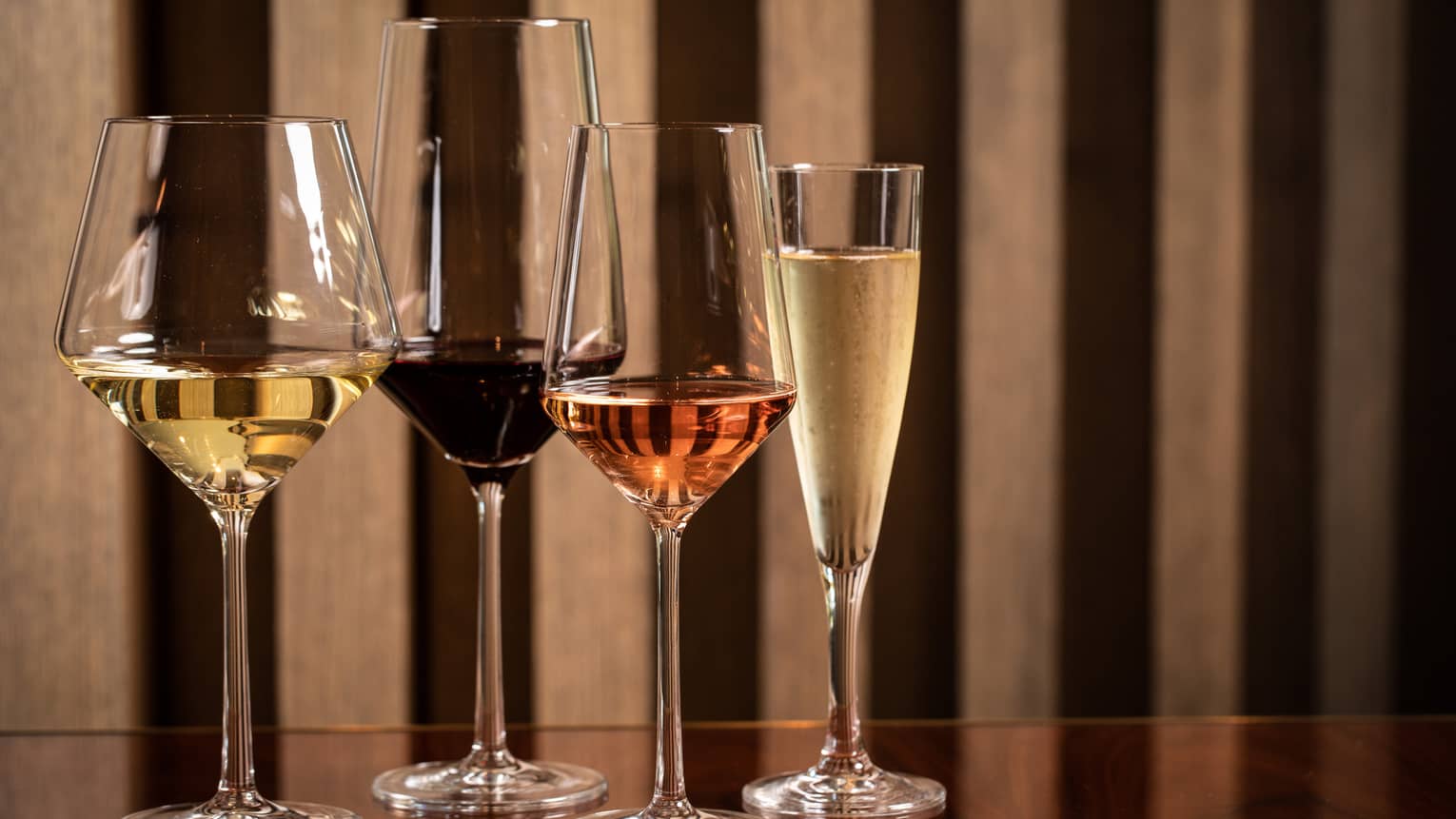 • Four modern wine glasses holding white, red and rose wine are lined up on a wooden table