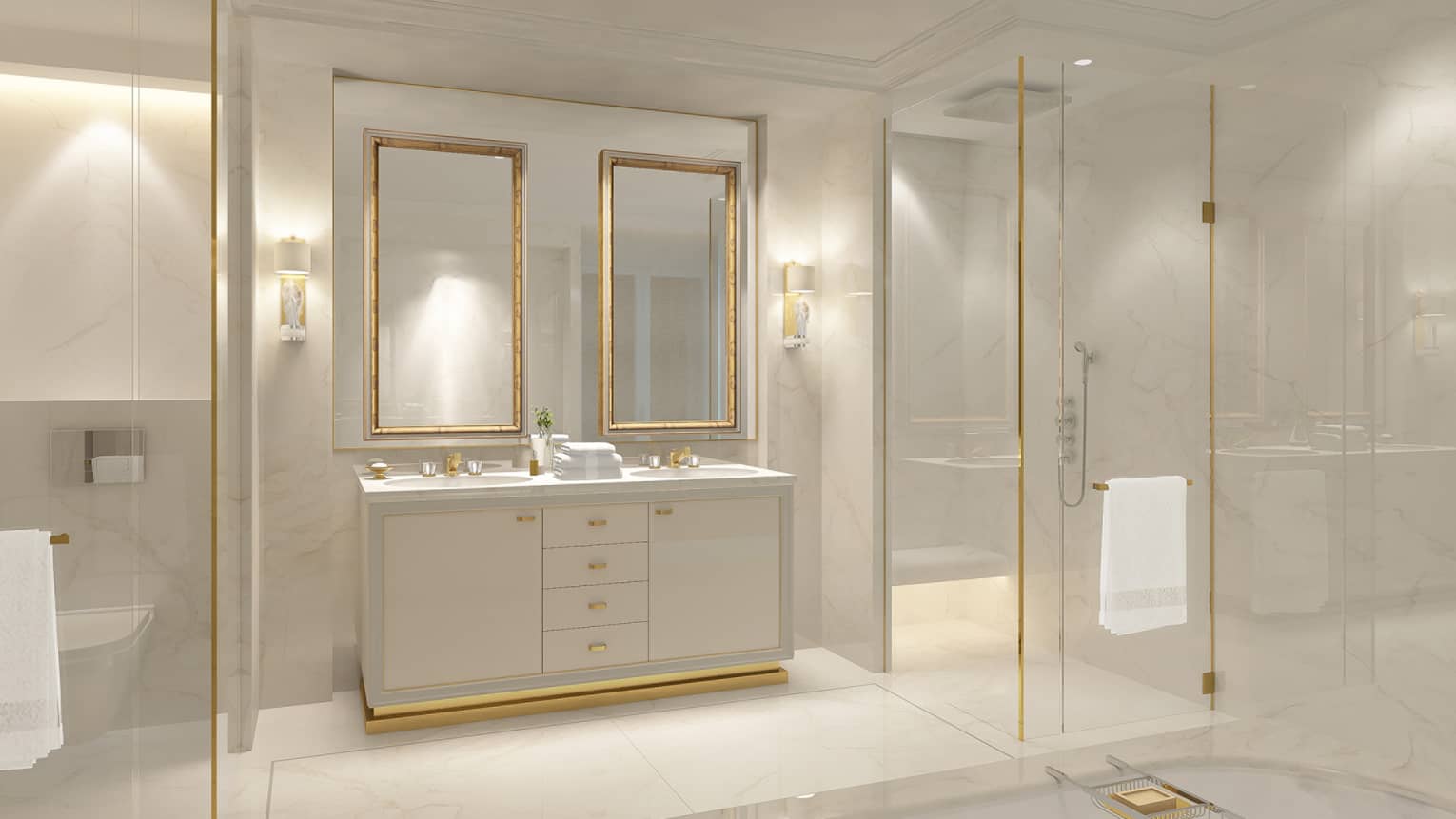 One full marble bathroom with double vanity per bedroom, plus one guest powder room