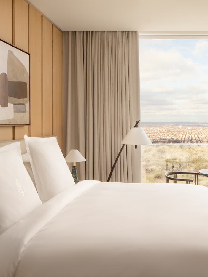 Designed with soft geometric patterns, natural wood and heritage-inspired artwork, this spacious guest room feels both stylish and residential. Floor-to-ceiling views reveal the Philadelphia skyline and the Hotel’s wildflower green roof, creating an ideal setting in which to relax above the clouds.