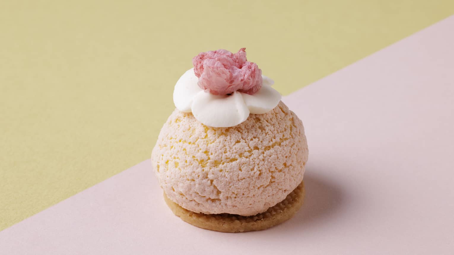Sakura Choux CreamA light, airy choux pastry is generously filled with sakura diplomat cream, delicate sakura chantilly and a vibrant cherry jelly at its heart. Garnished with sakura petals, this elegant creation captures the essence of the season both in flavour and presentation.