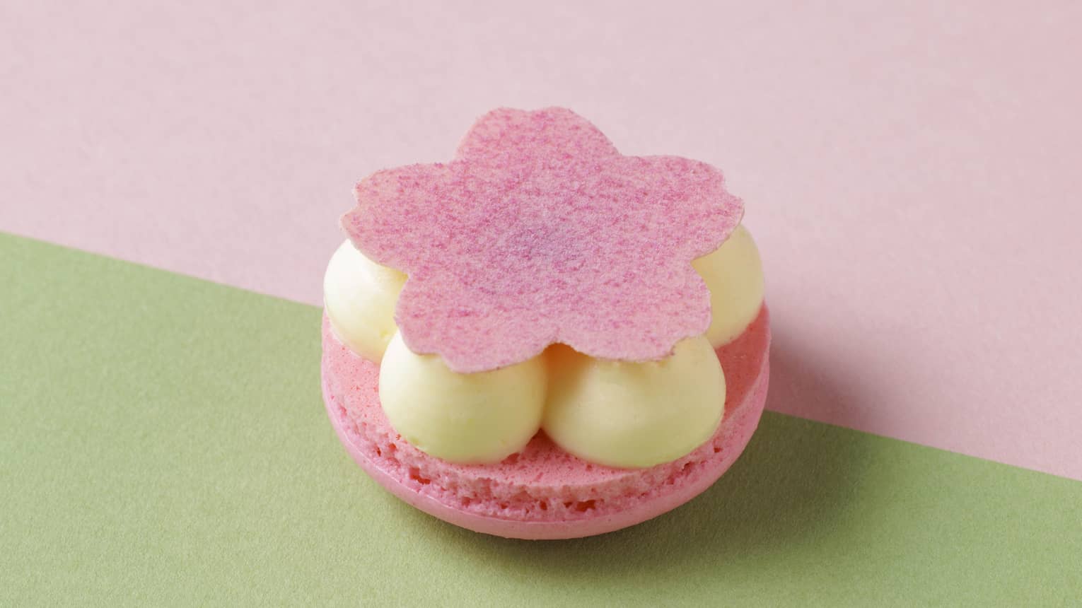Sakura MacaronDelicate macaron shells encase a creamy ganache infused with the subtle aroma of sakura leaves, complemented by a vibrant raspberry jam. With each bite, floral notes and bright fruitiness unfold gracefully, while its charming appearance delights the senses.