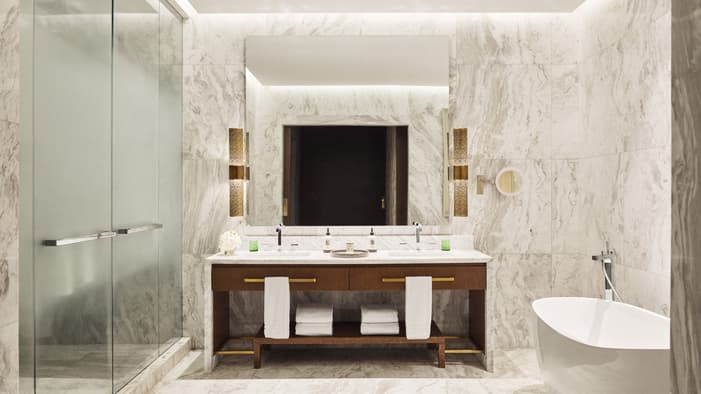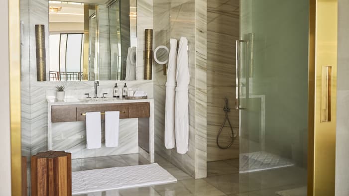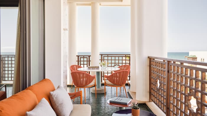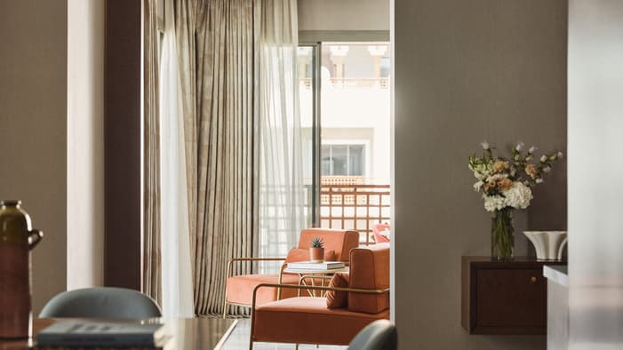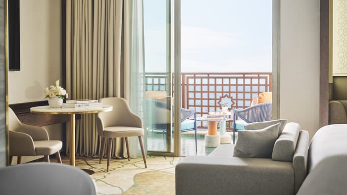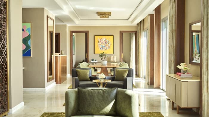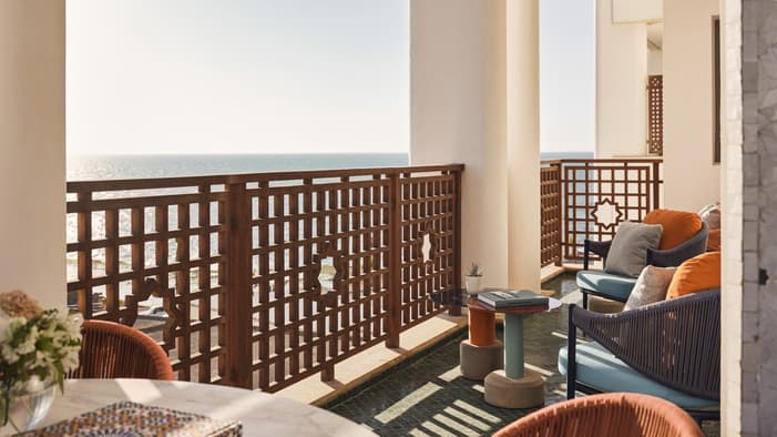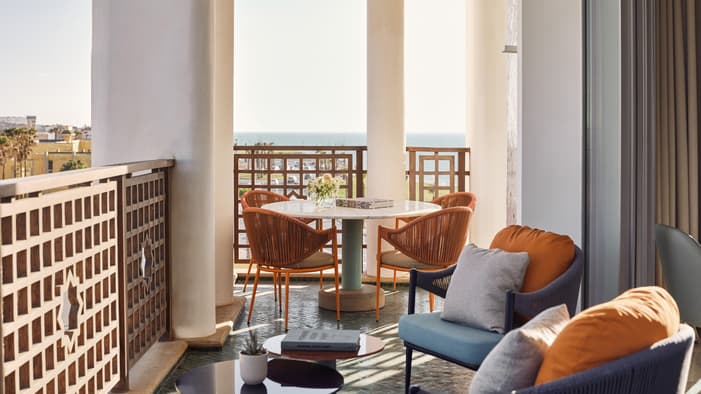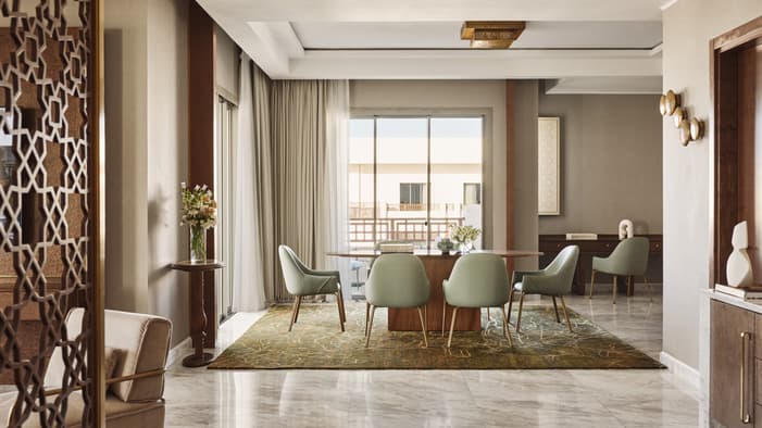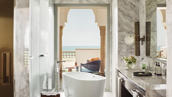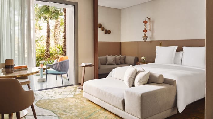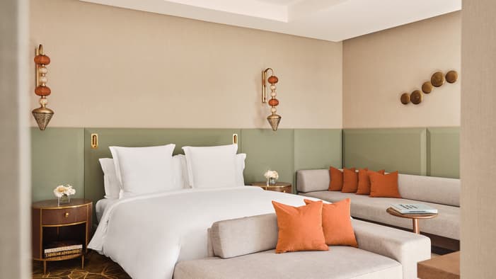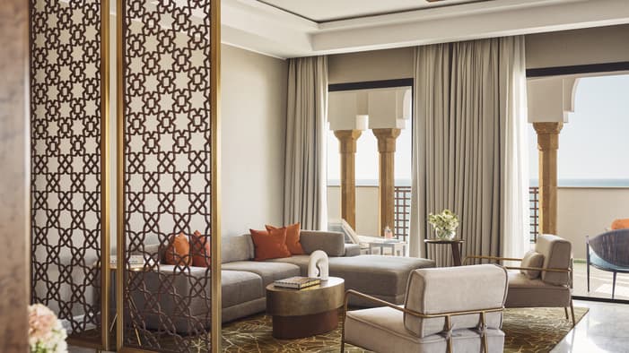 An urban oasis on the oceanfront, Four Seasons Hotel Rabat at Kasr Al Bahr offers Rabat luxury suites and hotel rooms that blend classic Moroccan architecture with sleek modern design. The interiors feature custom-made Zellige tiles, stained glass windows, and brass and copper fixtures. These authentic local materials are enriched with beautiful art and unique accessories, creating a mesmerizing space that weaves together historical stories with a forward-looking design aesthetic, ensuring an exquisite stay in a Rabat luxury hotel room.