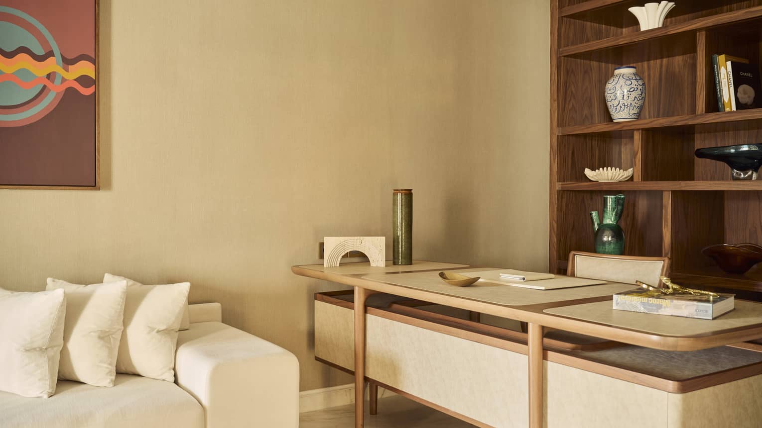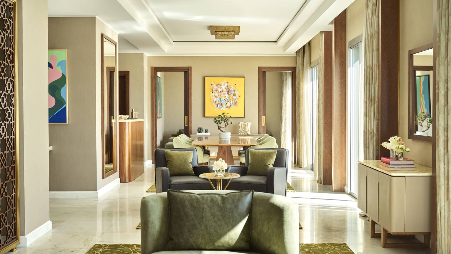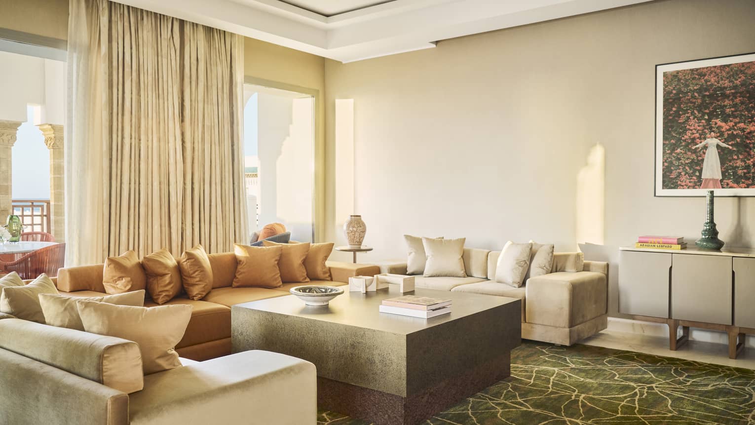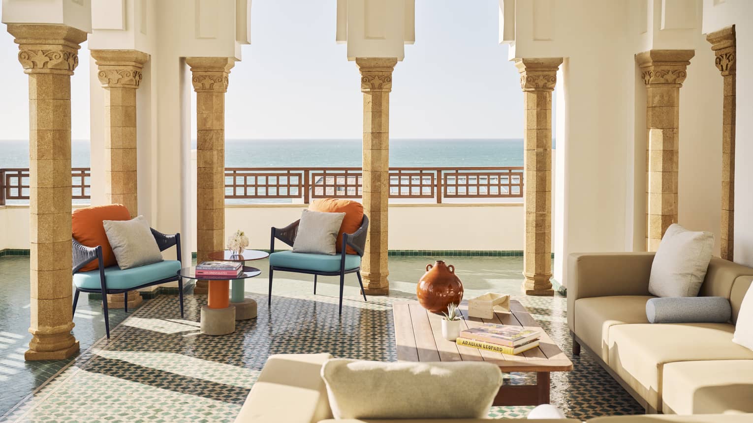 With panoramic ocean views from the fourth floor, this majestic three-bedroom suite features a large living room complete with dining table, as well as access to a comfortably furnished balcony. The suite is named after the sultan of Morocco, who reigned from 1792 to 1822 and led the construction of Kasr al Bahr, which would become his summer residence.