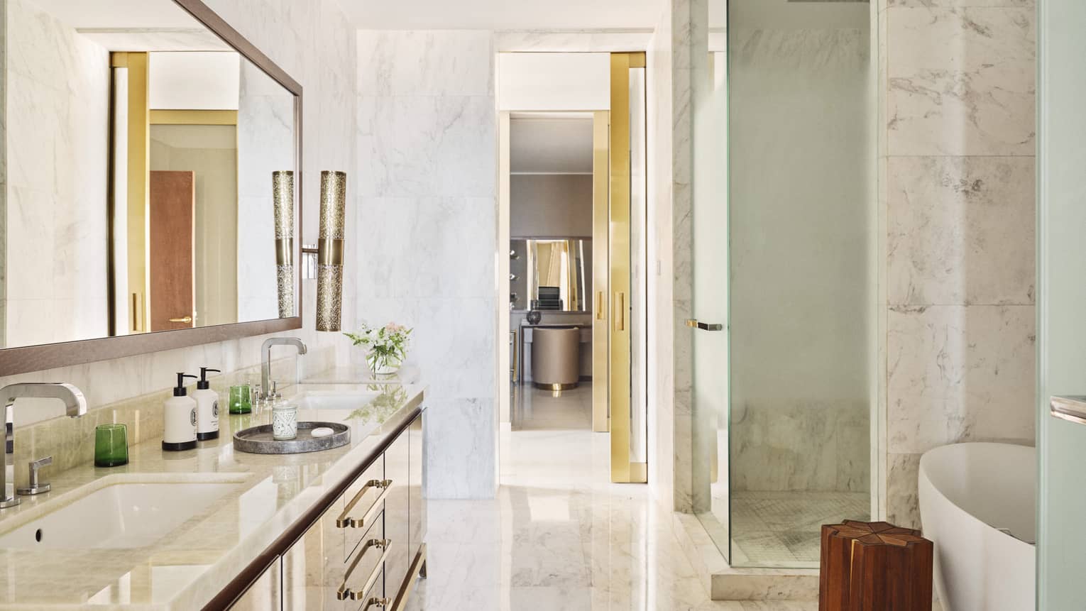 Three full marble bathrooms, each with a tub and separate shower, plus one guest powder room