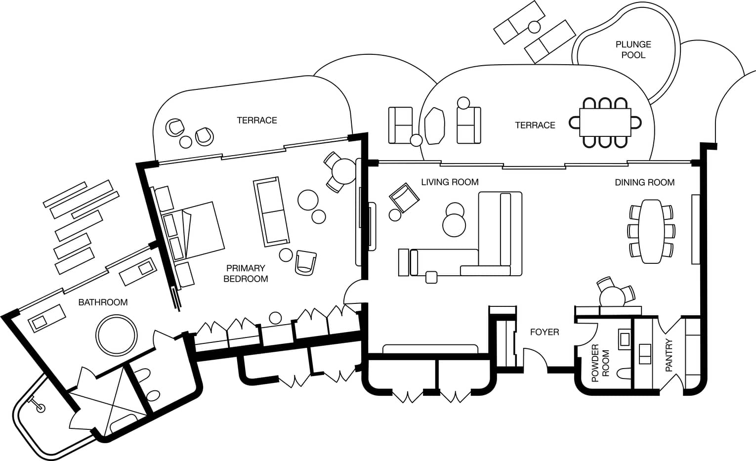 - Outdoor terrace with garden, plunge pool, two sofas and dining table for six