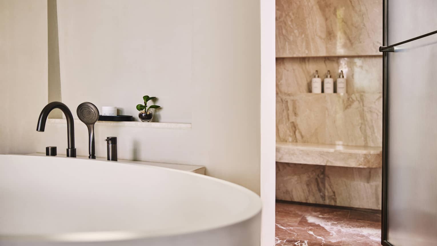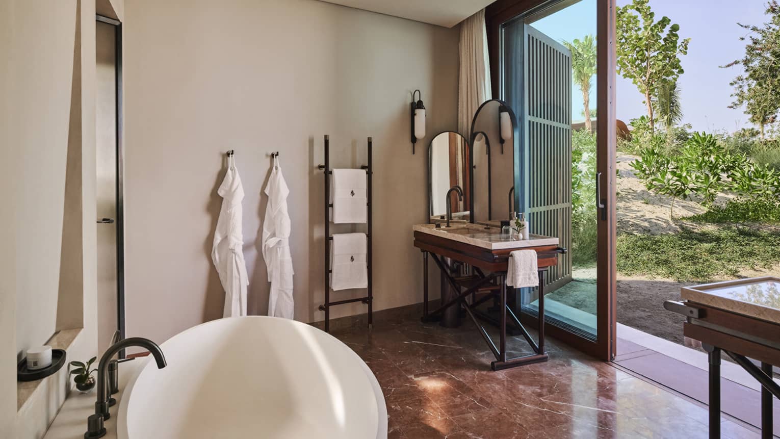 One full bathroom with dual sinks, free-standing oval tub, separate shower and sliding glass door to private outdoor space; One guest powder room with shower