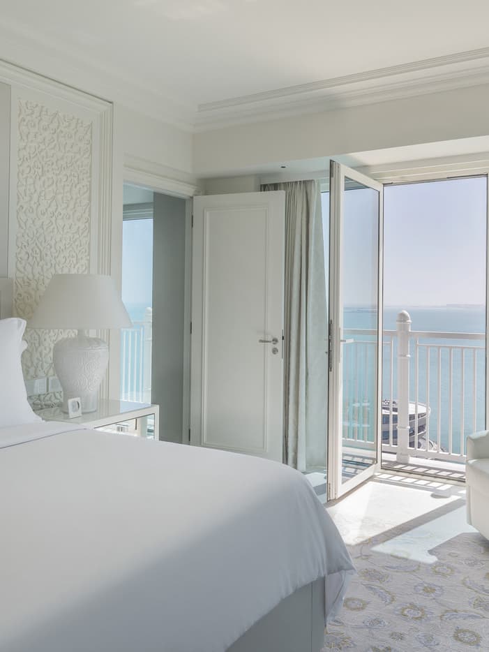 В этом угловом номере с тремя открытыми балконами, откуда открываются совершенно потрясающие виды на море, более чем достаточно места для деловых встреч и развлечения. Окна спальни, отделенной от гостиной массивной деревянной дверью, выходят на две стороны.