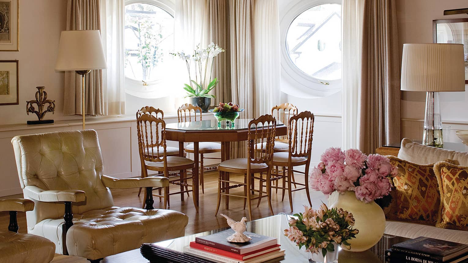 - Постельное белье Frette и мебель, обитая тканью Fortuny