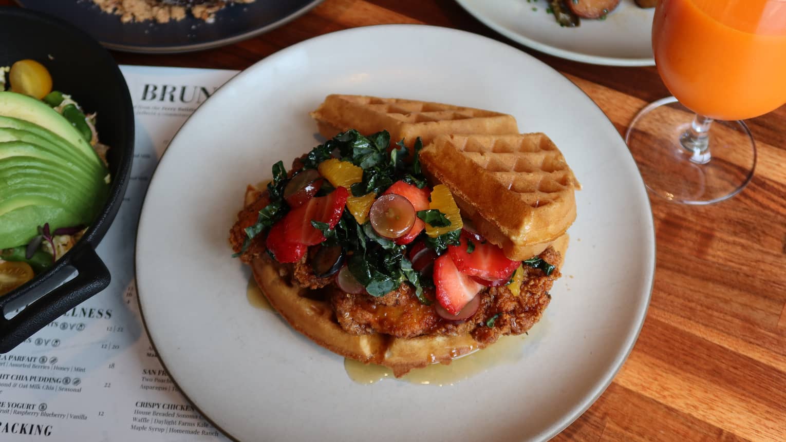 CRISPY CHICKEN & WAFFLE SANDWICHHouse-breaded Sonoma chicken thigh layered on a golden buttermilk waffle with Daylight Farms kale slaw, finished with smoked habanero maple syrup and house-made ranch.